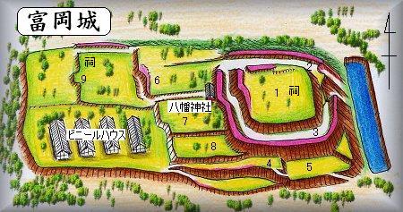 | (以前の記述)富岡城は、国道50号線の「立野橋」の信号から北に300m入ったところにある。この交差点の所からすぐ北側に見える比高10m余りの低い台地である。東西300mほどの独立台地であるが、遺構が見られるのは東端の部分である。台地下は水田や池となっている。 東南端の下の「史跡富岡城」という標柱の辺りから獣道のような細い道を3mほど上がると、そこが幅10mほどの腰曲輪で、すぐ向かいに城塁が見えてくる。高さは6mほどで、この腰曲輪の突き当たりにある土手状の部分の側面を通ってさらに側面の土手を上がるとその向こう側は横堀になっている。現状では深さ3m、幅8mほどであるが、かなり埋まっている感じがあり、本来の堀底はこの何mも下にあったはずである。この堀を越えるとそこが主郭部というべき郭になる。方60mほどの方形に近い形をした郭である。郭の周囲には低い土塁の跡が見られる。高さは50cmほどしかないが、崩壊してしまったものだろうか? また、内部には何かの祠が立っている。 主郭部の北西端が虎口と見られる部分である。主郭部の西、北側も、堀がぐるりと取り囲んでいる。規模は、南側と同程度だが、堀の外側の部分にも土塁を置く事によって、いったん堀の内部に入った敵が、また外に逃げ出すのを防ぐ工夫がしてある。これは石神城や石塚城など、戦国期の佐竹系の城郭によく見られる構造である。佐竹氏との関連性が考えられるであろうか。堀の北側には、南側と同様、幅10m前後の腰曲輪がある。 城址の主な部分はこれだけで、堀の西側には八坂神社、その下には民家や花を栽培するためのビニールハウスなどが建っている。この辺りに2郭があってもよさそうであるが、現状では遺構は確認できない。 |