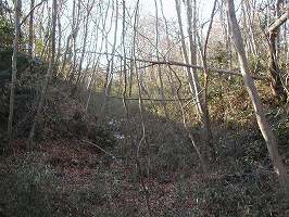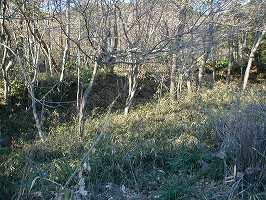 | 1郭周囲の横堀。深さ3mほどで幅は10m近くあるが、城塁が緩やかなのが印象的である。 | 1郭周囲の横堀が東側では台地下に竪堀のようになって落ち込んでいる部分。 |