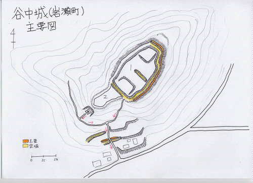 谷中城は、桜川市運動公園の温水プールのすぐ東側にそびえる、比高50mほどの山にあった。山の上を牙城といい、非常時にたてこもる場所で、城主は普段は山の下の居館に住んでいたという。ここも、単純な構造だったので、家に帰ってから思い出して図面を書いてみた。ざっとしか見ていないので、見落としがあちこちあると思うが、まあこんな感じである。