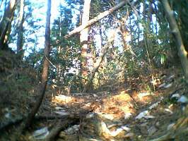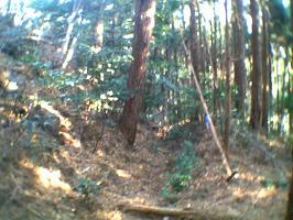 北西端の堀切は尾根続きになっている部分を区画するものであるが、深さは2m程度で、規模はそれほど大きくない。山麓から上がる道をまっすぐに登ってくるとこの堀切の部分に出るが、この道は一種の犬走りのようなものであったかもしれない。