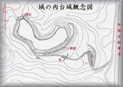 城ノ内台城は、常磐道の脇の山中にある。比高70mほどの山である。県道10号線の「常陸山部」というバス停と「塙」というバス停との間から、常磐道の下をくぐって城址の下まで行ける道がある。城址の東南端下まで行くと、山上に登っていく道が見える。最初はコンクリートの道であるが、誰も通る人がいないらしく、すでに登り口からヤブ状になっている。しかししばらく進んでいくとやがて普通の山道となり、城址北西端の堀切の所まで、この道は続いている。