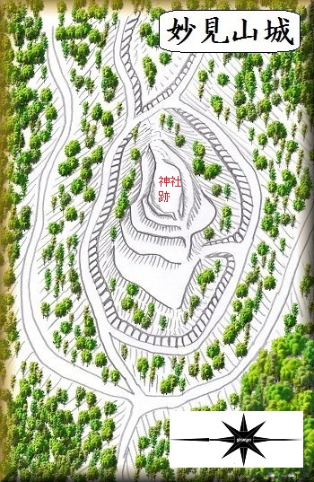 神社の周囲には縦横に道路が取り付けられていたようなのだが、神社に訪れる人もいなくなってしまった現在、道もすっかりヤブ化してしまっている。山全体もヤブに覆われており、この日、雨上がりでヤブが濡れてしまっていたので、登城は断念してしまった。そんなわけで右のラフ図は、Pの遺跡侵攻記の図を基に描いてみたラフ図である。次に訪れる機会を得た時にきちんと描き直してみたい。