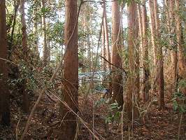 | 東側山麓から見た城の内台城。比高70mほどの山上にある。ちなみにこの麓の地名は「古屋」である。 | 台地基部との間を区画する堀切。深さ2mほどの小規模なものである。 |