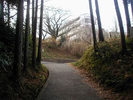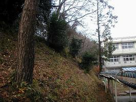 | 校舎脇に残る本丸西側の土塁。高さは6mほどあり、かなり高いが、本丸そのものが削られて低くなっているために高く見えるのかもしれない。 | 二の丸東側下には、かつての登校路があるが、これがもともとの大手口であったものだろう。 |
