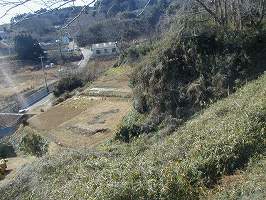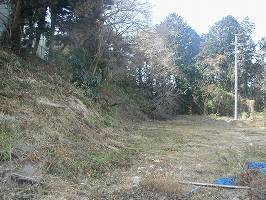 | 1郭北側の堀の跡。しかし現在では痕跡も見られない。 | 2郭北側下の腰曲輪から2郭の城塁を見た所。 |