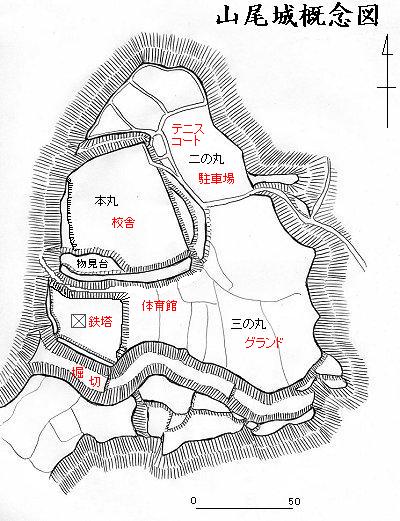 本丸のあるところが現在の本校舎。三の丸は体育館とグランドになっている。体育館の西側は高台となり、ここに鉄塔が建っているが、その南側に堀切が残存している。二の丸は駐車場とテニスコートになっている。
