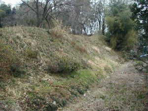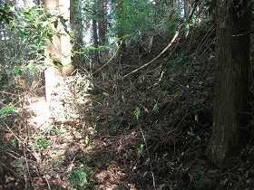 | 北側下にある帯曲輪・・・・だが、ヤブがひどくてよく分からない。 | 下の帯曲輪(横堀)から上の城塁が二段になっている部分を見たところ。 |
