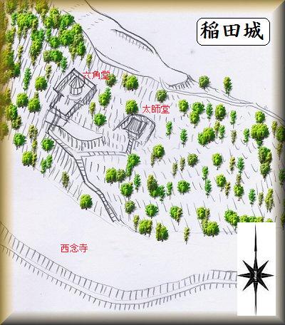 稲田城は国道50号線沿いにある「西念寺」の北側の比高20mほどの台地上にあったという。『茨城県遺跡地図』が記している場所は西念寺北側上の部分である。