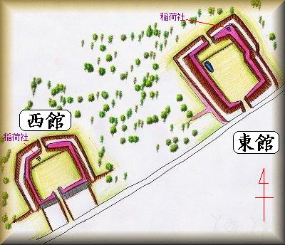 いずれも単郭方形の居館で、南北に1ヶ所ずつ虎口を持ち、北方に稲荷社を祭るなど、その共通性は高い。両者の距離は200mほどと近接しており、関連しあった居館であると思われる。