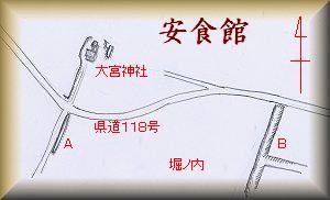 安食館は、安食地区の大宮神社の東南一帯にあった居館である。この一帯全域は比高15mほどの台地上にあるのだが、台地上は広大で、したがって館跡も平地の居館といっていい地取りとなっている。