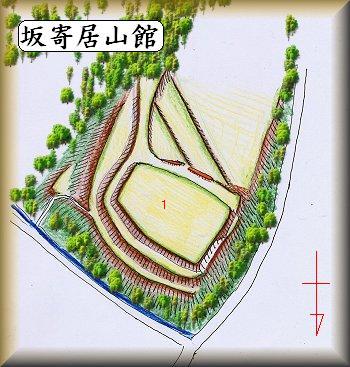 | (以前の記述) 坂寄居山館は、坂地区の北端、田伏地区との境界付近にある。田伏地区中台から、台地を降りていくと、向い側に見える比高10mほどの台地の先端部辺りが館跡である。登る道を探してみたが、なさそうだ。 見るとどの斜面も笹藪でいっぱいだ。しかたがないので、笹薮の中を無理やりよじ登っていく。すると写真の城塁が現れた。写真に撮ってみたが、笹藪がひどいので何が何やらわからなくなってしまう。 高さ1,5mほどである。この先が郭内ということで平坦地になっているのであるが、なにしろ笹だらけでまったく見通しが利かない。というわけで、郭がどんな形をしているのかさえ見当もつかない。 このまま歩いているうちに方向もわからなくなってしまいそうで、早々に退去した。 「重要遺跡報告書」の略即図を見ると、先端には方50mほどの土塁をめぐらせた郭、さらに土塁で区画された2郭があり、台地基部との間には堀切がある。 これらの遺構を確認したくて台地基部の方にも回って見たのであるが、こちらも民家の敷地内を通り抜けないと行けないらしく、さっぱりたどり着けない。 城主等歴史についても未詳であるが、一説では坂地区の領主であった佐賀氏(あるいは坂氏)の居館ではなかったかともいう。 |