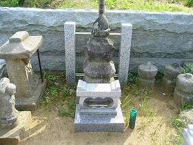 | 1郭と2郭との間の堀切。だいぶ削られているが、もともと堀切状になっていたという。 | 田伏家の墓所にある古い五輪塔。戦国期くらいのものではないだろうか。 |
