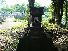 | 城址東側の現状。すっかり墓地と化しているが、このような段々の地形はほぼ旧状の通りだということである。 | 先端にある青祖神社(秋葉様)の祠。 |