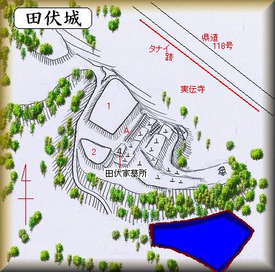 山麓にある実伝寺は、応永3年(1396)2月15日に没したという、この実伝が生前、観音菩薩を祀って建立したものだという。それで実伝寺という寺名になっているわけである。寺院のある場所は「タナイ」と呼ばれる堀と背後の台地とに囲まれていたというから、本来、田伏氏の居館は現在寺院のある場所に存在していたのではないだろうか。戦国時代が近くなるにつれ、要害を欲した城主が、山上に居館を移し、空いた山麓に寺院を建立したのではないかとも想像できるだろう。
