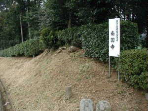 というわけで場所が分からなかったので、この番地を頼りに探してみた。この番地の近くには写真の南円寺があり、その入口には土塁らしきものがある。これがそうであるのだろうか。