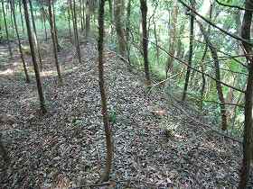 | 2郭北東側の城塁。 | 1郭と2郭との間の堀切。深さ4m、幅6mほどある。 |