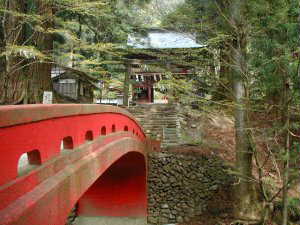 渓流に掛かる赤い橋越に花園神社の入口を見たところ。神社が城址であるというが、背後には高い山がある。向側も急峻な山だ。この山上が城址であるのかもしれない。