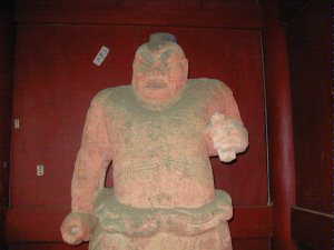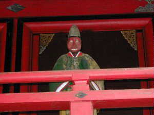 神社本殿に立つ守護像。何かの侍をかたどったものか。なんだかユーモラスな像である。