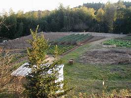| 1郭と2郭との間にある土壇の上に神社が鎮座している。天守台のような方形の土壇である。 | 土壇の上から1郭を見たところ。一面の畑である。城塁の下には腰曲輪もある。 |