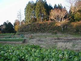 さらに6mほど上がって台地上に行くと、2の郭と3の郭との間の部分に出る。畑地になったため後世改変されているようだが、ここには空堀があって、2つの郭を区画していたものだろう。なんとなくその名残が伺われる。通常は先端部が主郭ということになるが、2の郭の方が3mほど高くなっている。こちらが優位の郭ということである。先端部の3郭は20m×40mほどの広さである。この郭の中央部には古墳があったようだが、現在では削られて無くなっている。ここに続く2郭は40m×60mほどある。