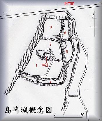 | 島崎城は、松井城とも呼ばれ、嶋崎盛幹が居城していたという。(「城郭体系」) 六孫王源常基の孫である多気兵部丞実基が城主であったという伝承もあるようだが、それは怪しい。構造から見てだいたい戦国期のものと見てよいだろう。車城の支城であったものだろう。「常北遺聞」によると竜子山城主大塚掃部助の出城であり、滝対馬という者が城番として在城していたという。 | |
