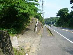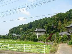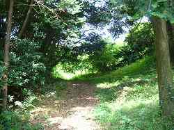 | 県道2号線から見た前館のある台地。比高20mほどである。この中央部分に土塁で囲まれた1郭がある。 | 前館への登り口。この細い道を上がっていったところである。 |