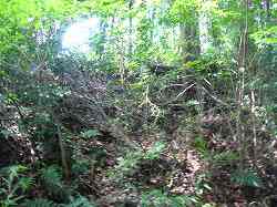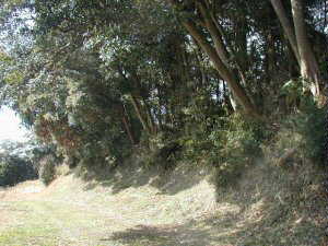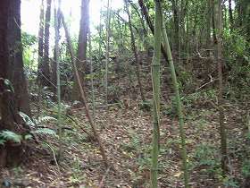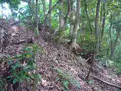 | 1郭西側の土塁。だいぶ崩されたらしいが、ここから先は残っている。 | 1郭の東側下の横堀。薬研状で深さは5mほど。 |
