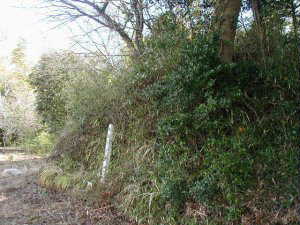 | Aの土塁と城址標柱。この外側下には腰曲輪がある。 | 墓地との間にあるBの土塁。高さ2mほどと、なかなか大きい。 |