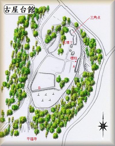 県道185号線沿いで、平福寺の北側にそびえる比高25mほどの台地が古屋台館の跡である。台地の南端には、この平福寺の墓地が営まれており、下の県道からでもこの墓地の存在を確認できる。