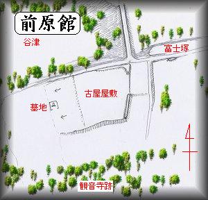 前原館は、県道2号線の「笠松」というバス停の北西側に展開する台地全体を取り込んでいたようであるが、現在は改変がひどくて、城郭としての区画性はかなり失われてしまっている。場所も分かりにくい。県道2号線沿いの1202番地の辺りにある道を西側に入っていくと、富士塚の脇を通って、その突き当たり辺りの畑になっている所が「古屋屋敷」と呼ばれているところで、館の中心部分であったと思われる。