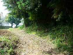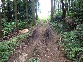 | 東側の堀切2。深さ4m、幅6mほどの堀切である。 | 出城の南側を通っている道。この道を監視するための晩所のような機能を持っていたと思われる。 |