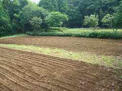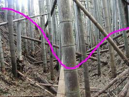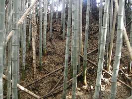 | 「古屋屋敷」部分への入口。右側は土塁のように見えるのだが、藪がひどくて把握しにくい。この土塁の北側の道は、横堀の跡であるかもしれない。 | 古屋屋敷の西側。斜面が傾斜しており、耕地整理で改変されているように思われる。奥に「下河辺家」の墓地がある。 |