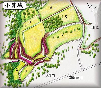 1の郭から接続する5の部分や、民家の建つ7の部分なども郭であったと思われるが、縁部が削られたりしてかなり改変されてもいるようである。しかし、台地に上がる道路の東側に「出曲輪」という部分があることから、5や7辺りまでは城内であったと見てよい。