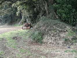 | 高岡城(御門山)の虎口。両脇は堀切になっているが、ヤブになっている上に、ごみが捨てられていてよく分からない。 | 御門山の郭内には一部土塁のようなものが残っている。古墳のようにも見えるが、一応、土塁の残欠と見てよいであろう。 |