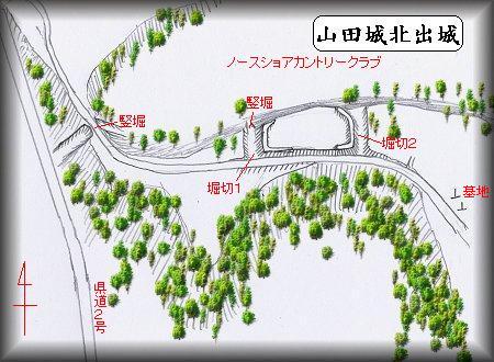 山田城の北出城(仮称)は、石崎氏によって発見されたものである。県道2号線沿いに大枡神社があるが、その300mほど南側に、東側の台地に上がり、南側奥に進んでいく細い道がある。その道を進んでいくとやがて、台地基部が細くなっている所に竪堀があり、さらに進んでいった先に、図にあるような単郭の砦のような構造物を見ることができる。この細い道路沿い進んでいくと、道の北側にはっきりと堀切の跡をみることができるので(ただしヤブになっている)、見るべき人が見れば、すぐにそこが城址であることが分かるであろう。