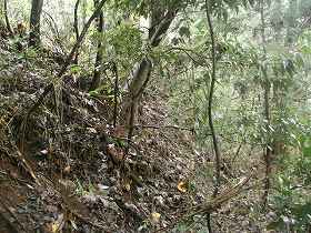 | 中城台地基部辺りにある切岸。 | Aの横堀が大きくクランクしている部分。といっても竹ヤブでよく分かりにくい。城内側の切岸は高さ8mほどもあり、大規模な遺構である。 |