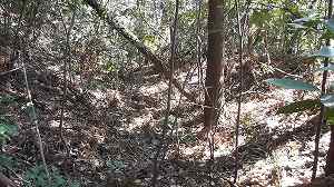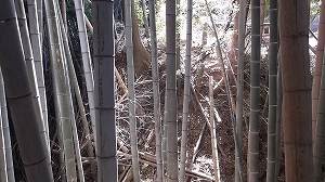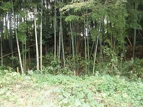 | Bの櫓台下の横堀。堀は東側に回りこんではおらず、東端で行き止まって終了する。 | Cの堀を、堀の北側の土塁上から見たところ。竹が密集していて形状を把握しづらい。 |