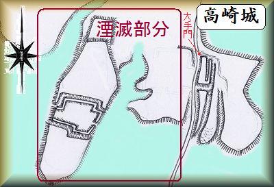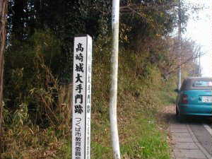 (以前の記述)高崎城は、県道46号線の「天玉喜」というバス停の600m北側の地点にある。この辺りには、その名も「城山」という住宅街があるのだが、その東のはずれの道の脇に写真の「高崎城大手門跡」の標柱が立っている。