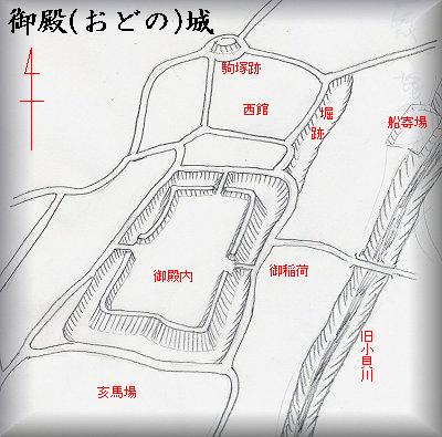 耕地整理前に残っていたのは「御殿内」と呼ばれる単郭部分であったようだが、北に西館という字が残っていること、その脇に堀跡があったことからすると、もともとは少なくとも2郭を持った城館であった。
