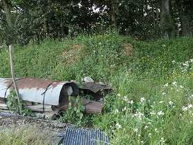 | 城塁の北側には高さ1.5mほどの土塁が残っている。 | 土塁の切れ目が堀切の名残のようになり、そこに墓地がある。この堀切は3の堀と接続していたのではないかと思われる。ところが、この墓地の辺りに「御寝所」という地名が残り、殿様が休んでいた所であると言う伝承もある。堀底が「御寝所」というのもちょっとおかしい。どういうことなのだろう。 |