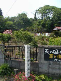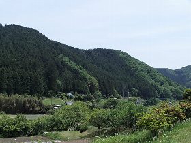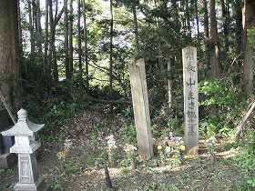 | (以前の記述)大岩城は、県道12号線の栃木県烏山町との境から1200mほどの県道の南側、小舟川を渡ってすぐの所にある、比高70mほどの独立した山にあった。県道12号線から、油河内地区に抜ける山道があるが、そのすぐ西側の山である。山の麓には人の住んでいない小さな寺院が建っている。城内は山林化しているようで登城道もよく分からない。しかし、緒川村は、城址に限らず、ありとあらゆる遺跡に標柱を立てているので、城址の位置だけはすぐ確認できるのがありがたい。人気のない寺院の脇にひっそりと標柱が立っている。 城主等は未詳だが、佐竹氏に属した土豪の城であろう。 |