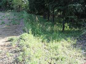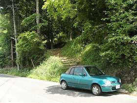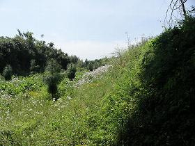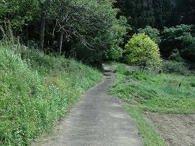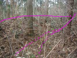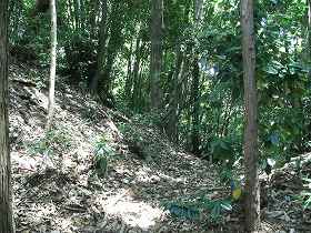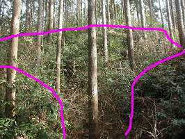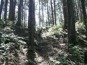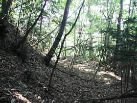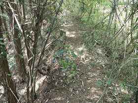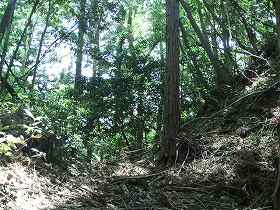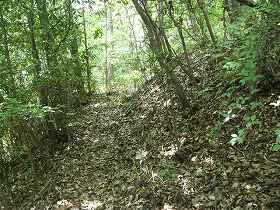 | 図の8の部分に登り口がある。写真のようにしっかりとした道になっているので、すぐに分かるであろう。ただし、すぐ上の墓地を過ぎると、ちょっと分かりにくい道になってしまう。 | この道を上がっていくと、4と6との間の虎口形状の部分に出る。堀切状とも言えるが、深さは1mほどしかない。 |