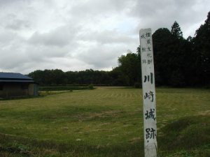 | 南側の橋の上から見た川崎城・・・・と言いたい所だが、これは川崎遺跡であり、川崎城本体はもっと奥の方であろうと思われる。蛇行する緒川に臨んだ比高20mほどの台地先端であった。 | 川崎城跡の標柱。道路のすぐ脇にある。城内は一面の芝になっているが、芝を栽培しているのだろうか。この標柱、何年かぶりに訪れたらだいぶ傾きかけていた。平成11年に立てたもののようだが、あと何年かで腐って倒れてしまうかもしれない。緒川村は統合されて常陸大宮市になってしまったが、常陸大宮市がこうした標柱の管理をしっかり引き継いでくれるのかどうか、ちょっと心配だ。 |