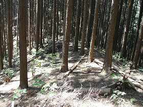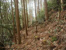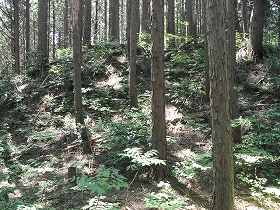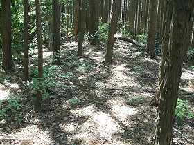 | 6の郭の北側の土手は高さ2mほどの切岸になっている。ただしこの郭、北側(城内側)は切岸整形をしているのに、南端の方は自然地形のままである。 | 3の方向から4の尾根を見た所。この城は基本的にはこのような尾根そのままの部分が多い。幅も概して10m未満である。 |