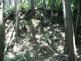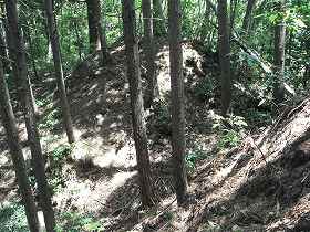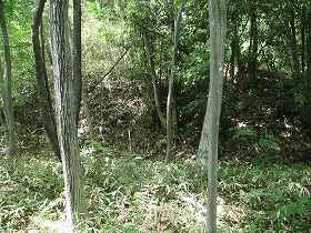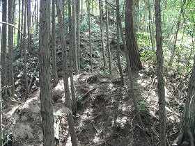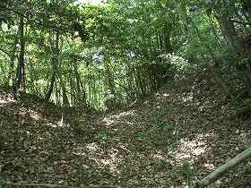 | 1郭土塁。削り残したもので、高さは1mもない。比較的幅が広い。 | 1郭北側の堀切1。堀切の外側に古墳のような土壇を築いて堀の深さを深くしている。城内側で5mほどの深さがある。 |