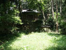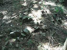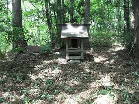 | この上の部分は郭というよりも、地勢が傾いていて自然地形に近い。その先に5の堀切がある。深さはやはり3mほどで、似たような構造である。坂虎口の形状も同様。両端を竪堀でしっかりと区画しているのが印象的である。 | 1郭内部も削平が不十分で、けっこう自然地形の部分が残っている。その中央部分には写真の祠がある。もう人がお参りに来ている形跡はない。 |