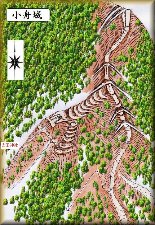 小舟の吉田神社背後の山稜一帯が小舟城の跡である。