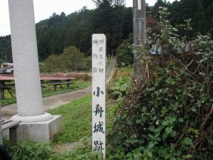 | やすらぎの里公園から見た小舟城。主郭部分の比高は、下から100mほどである。左側の一番高く見えるところが図の7の辺り。 | 県道沿いの吉田神社の鳥居脇にある城址標柱。ここにあったのでは、神社が城址と勘違いしてしまうであろう。 |