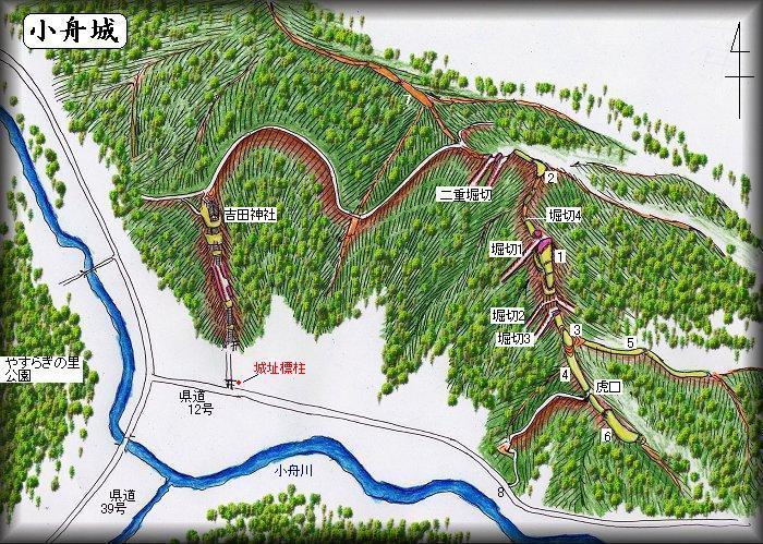 | (以前の記述)小舟城は、県道12号線と39号線が交わる交差点の北側にある比高50mほどの山中にあった。道路を挟んで西側には「やすらぎの里公園」や、その展望台などがよく見える。 標柱のあるところから上がっていくと、そこは吉田神社である。急な石段を20mほど上がると、両脇を土塁に囲まれた細い道が神社に向かって続いている。道の両側は切り立った崖である。まっすぐ50mほど行くと本殿の下の郭にでる。方30mほど。そこから10mほど石段を登ると本殿のある郭である。この辺りに城主の居館などがあったのかもしれない。 本殿の背後も高くなっており、城址はさらに山中に続いている。 小舟城は、鎌倉時代に高沢氏によって築かれたのに始まるという。 また天文期には、小瀬城主小瀬氏の家老で内田弾正左衛門という者が小舟城主であった。位置的にも小瀬城の北西3kmほどと、近接した場所にある。天文9年(1540)春、部垂義元が佐竹本家に対して乱を起こしたとき、小舟城主内田弾正左衛門は、兵を率いて部垂城の救援に向かった。しかし、部垂に近づいてくると城がすでに燃え上がっているのが見えた。 「う〜ん無念、あれは部垂城が燃えているのだ。救援に掛けつけたというのに、間に合わないとは申し訳ない」 そう言って弾正左衛門は切腹して果てたという。もっともこれは伝承に過ぎず、実際にこの人物が城主であったのかどうか明確な証拠はない。 |