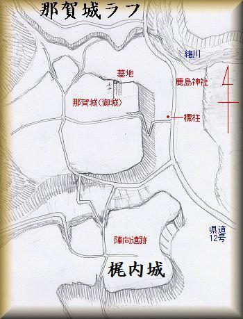 梶内城は、「茨城県遺跡地図」にも掲載されていない。しかし、現地には写真の「陣向遺跡」という標柱と「梶内遺跡」という標柱が建っている。これだけでは何の遺跡なのかは不明であるが、地元の方に伺った所、「城は、那珂城と梶内城の2つがあった」という話であったので、ここも城址として紹介することにした。(遺構現況は那賀城の項目を参照していただきたい。)